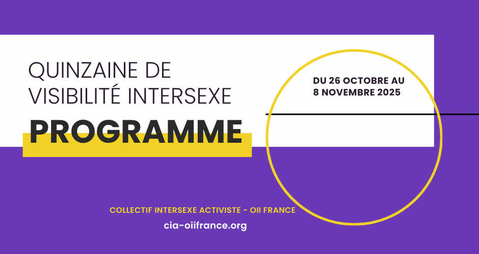 Quinzaine de Visibilité Intersexe 2025 : demandez le programme ! Lire l'article Quinzaine de Visibilité Intersexe 2023 : un rendez-vous incontournable ! Lire l'article Quinzaine de Visibilité Intersexe 2023 : demandez le programme ! Lire l'article Communiqué de presse : QUINZAINE DE VISIBILITÉ INTERSEXE 2022 : UN PROGRAMME HAUT EN COULEURS ! Lire l'article Nouvelle Bande Dessinée pédagogique « I comme Intersexe » Lire l'article Les événements de la Quinzaine de Visibilité Intersexe 2022 Lire l'article Le Programme de la Quinzaine de Visibilité Intersexe 2022 est sorti ! Lire l'article Journée Internationale de Sensibilisation Intersexe (Intersex Awareness Day) Lire l'article Quinzaine de Visibilité Intersexe 2020 Lire l'article Quinzaine de Visibilité Intersexe – Ce 26 octobre 2019, notre Journée de Sensibilisation Intersexe s’inscrit dans un engagement constant ! Lire l'article 1 2